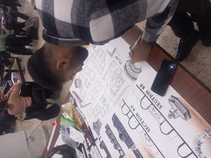 A man in a checkered shirt leans over a table covered with architectural plans. He's drawing on a plan labeled "PLAN" while a black smartphone rests nearby. The table is cluttered with pencils, markers, and other drawing supplies. Other people sit in the background, suggesting this is a public space or a classroom setting. The plans depict sections of a building, including elevation views labeled "SECTION AA" and "SECTION BB."