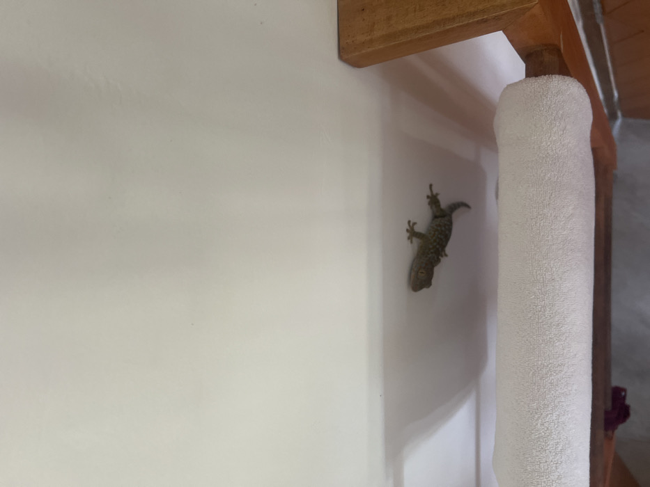 - "A gecko clings to a white wall near a towel rack" by FM-OUOIE3, licensed under CC BY 4.0