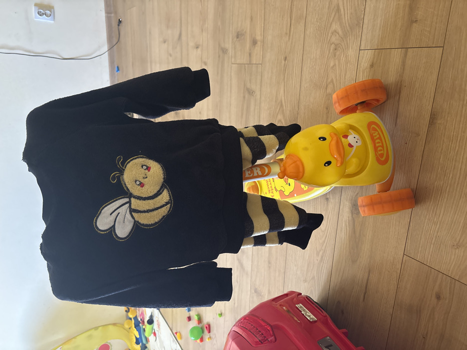 An indoor scene in Sisian, Armenia, depicts children's clothing draped over a toy scooter on a light-colored wooden floor. The clothing consists of a black, long-sleeved sweater featuring a large, embroidered yellow and white cartoon bee on the chest, paired with horizontally striped black and light yellow pants. The pants are positioned to appear as if worn by the scooter. The toy scooter is yellow, has three orange wheels (two visible at the front), and a molded yellow duck head with an orange beak and cap at its front. The letters "DDW" are visible on the scooter's base. To the left, a portion of a red plastic toy car is visible. In the background on the left, numerous colorful toys, including a green ball and various blocks, are scattered on a white and blue playmat. A light-colored wall with a visible electrical outlet and a white cable is present in the upper right background. The room is brightly illuminated. No individuals are present in the image.