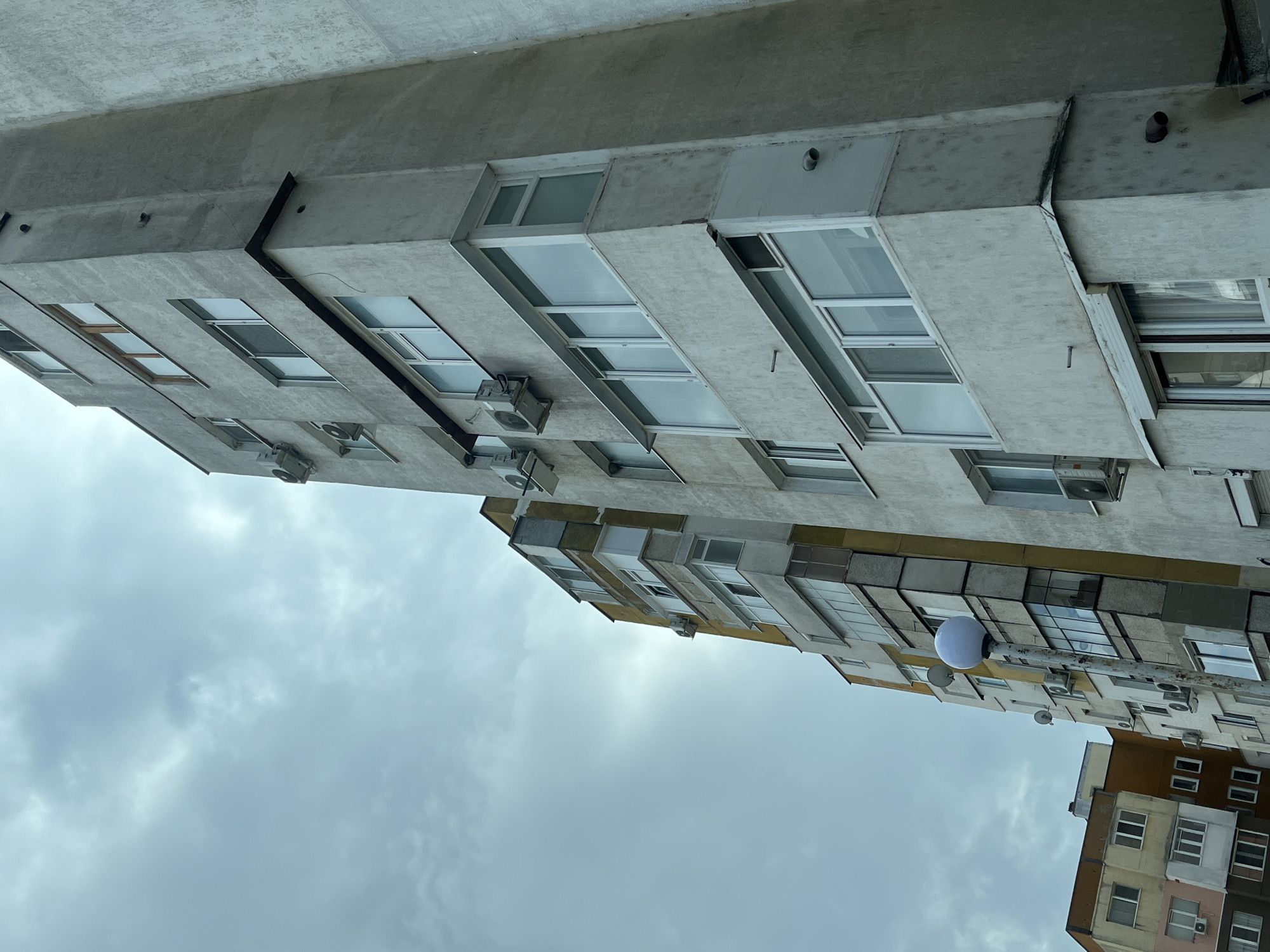 The image depicts a low-angle view of several buildings against a cloudy sky. The buildings appear to be apartment blocks with multiple windows and air conditioning units. The architecture is simple and utilitarian, typical of residential buildings in Eastern Europe. A white globe-shaped lamp is visible on one of the buildings. The image is taken from an upward angle, emphasizing the height of the buildings. The buildings are located in Vratsa, Bulgaria.
