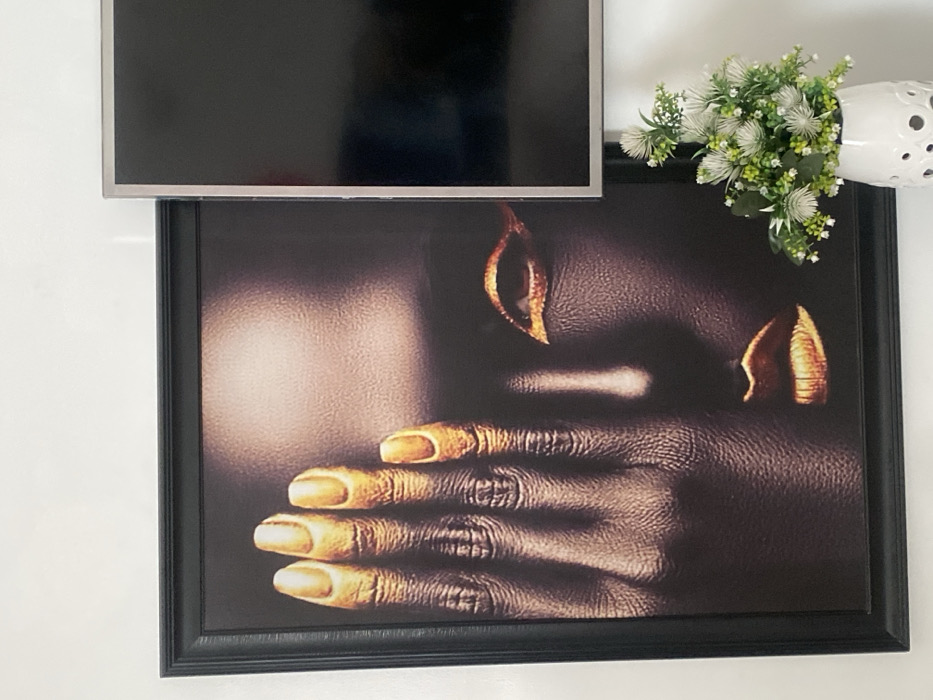 An interior scene in Lekki, Nigeria, displays a large, black-framed artwork depicting a stylized human face with dark skin tones and metallic golden accents