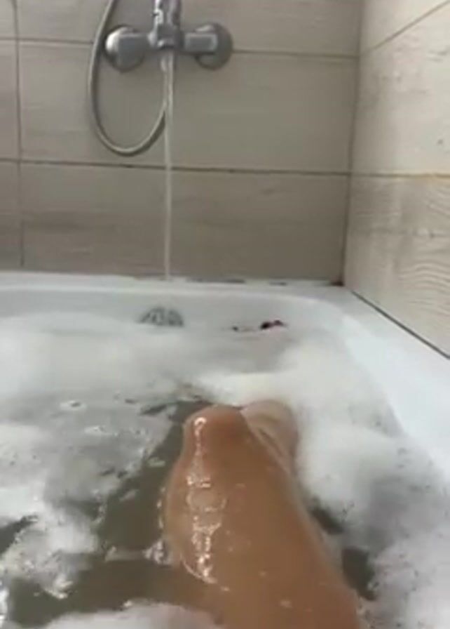 A bathroom scene shows a white bathtub filled with bubbling water, with a leg visible partially submerged