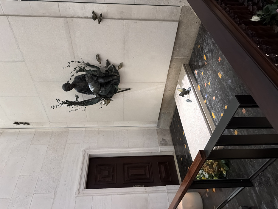 The image displays an interior view of the tomb of Francisco Marto, located within the Basilica of Our Lady of the Rosary of Fátima in Fátima, Portugal. The scene is observed from a slight elevation, looking into a recessed area. A large, light-colored stone wall, composed of rectangular blocks, dominates the background. Centrally mounted on this wall is a bronze sculpture depicting a young boy, seated and holding a lamb. Stylized bronze branches with leaves extend from the sculpture, and additional bronze leaf motifs are affixed to the wall to the right. Below the wall sculpture, a raised, rectangular slab of light-colored stone forms the tomb, positioned on a dark tiled floor. Two small bronze bird sculptures, one larger than the other, rest on this tomb slab. The floor surrounding the tomb features dark square tiles interspersed with smaller, scattered square tiles in shades of yellow, orange, and pink. To the left, a dark brown wooden door with multiple panels and a light-colored frame is set into a wall of similar stone blocks. A dark brown wooden handrail and a black metal railing with vertical slats are prominent in the foreground, partially obscuring the lower left. Behind the railing on the far left, a white cylindrical object and yellow floral arrangements are partially visible. The lighting is even, suggesting an indoor, reverent environment.