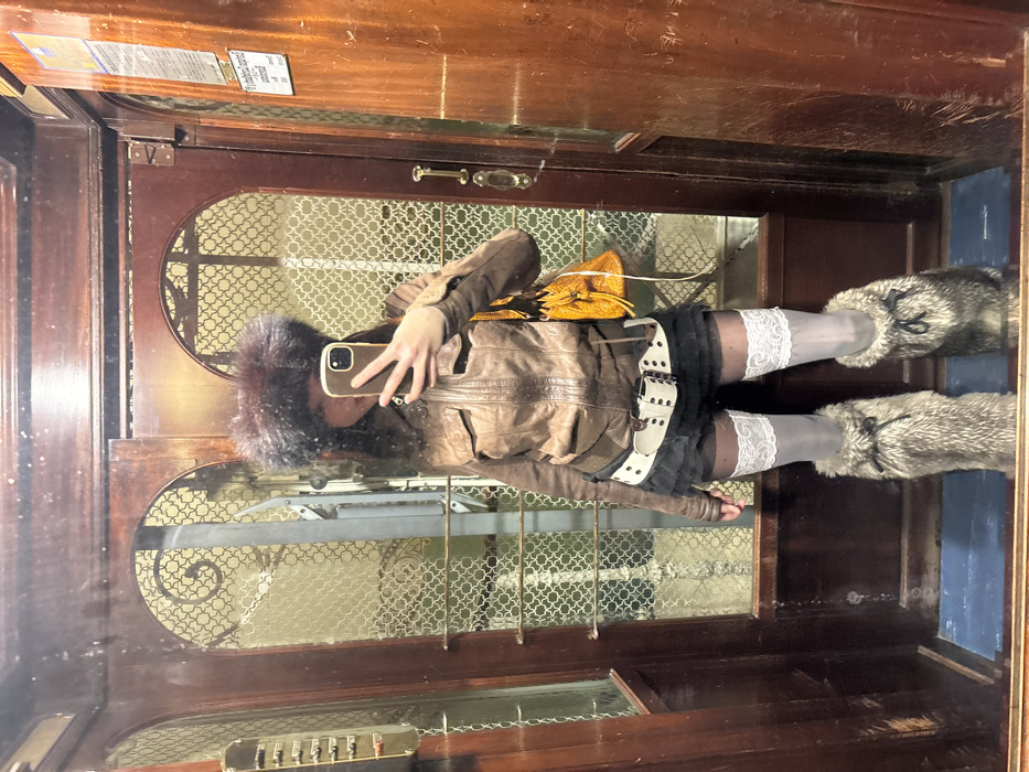 A mirrored reflection captures an individual dressed in a brown leather jacket, a black tulle skirt cinched with a white belt, and lace-trimmed socks paired with furry, gray boots. A yellow handbag is visible, and the person is holding a phone to take the picture. The background features an old-fashioned elevator with ornate metalwork and wooden paneling.