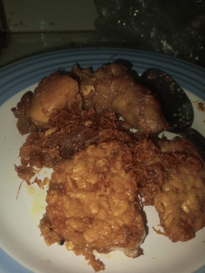 The scene, located in Karaikudi, India, displays a meal served on a white ceramic plate with a blue-banded rim. The plate contains multiple pieces of cooked poultry, likely chicken, characterized by a dark brown, somewhat glazed surface. These poultry pieces are mixed with and covered by a substantial amount of reddish-brown, finely shredded or crumbled, fried material. Additionally, two distinct, irregularly shaped, golden-brown fried patties are present; one large, mostly intact piece is in the lower-left quadrant of the plate, and a smaller, fractured piece is in the lower-right. A dark-colored serving spoon, possibly patterned, is partially visible on the right side, resting on the food. A metallic fork tine is also partially visible adjacent to the spoon. The lighting is dim, and the background is out of focus, showing a light-colored horizontal surface behind the plate and an indistinct, dark area above it. No individuals are present in the image.