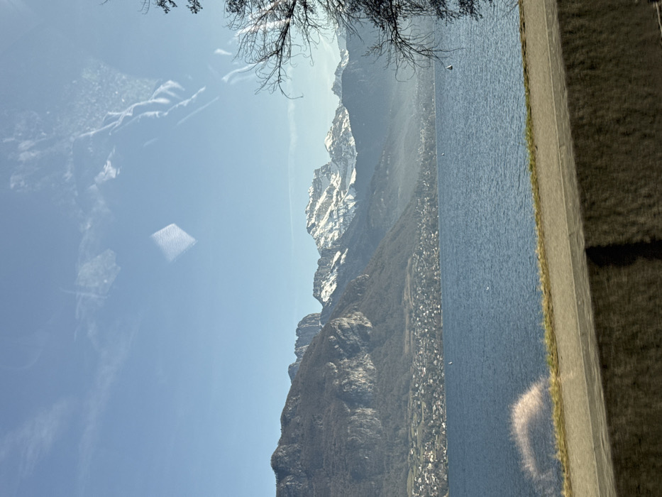 This image presents a panoramic view of Lake Annecy, France, under a clear blue sky, observed from what appears to be a moving vehicle based on visible reflections on the glass. The immediate foreground features a dark gray concrete barrier extending horizontally, topped by a narrow strip of dry, light-colored grass. Partially visible on the far right are the bare, dark branches of a deciduous tree. The expansive, deep blue waters of Lake Annecy occupy the mid-ground, appearing calm. Two small, white buoys are discernible on the water's surface, one centrally located and another towards the right. Across the lake, a dense settlement of numerous light-colored buildings is situated along the shoreline at the base of a rugged mountain range. This range is predominantly dark green and brown with areas of exposed grey rock. Beyond this immediate mountain range, majestic snow-capped mountains rise prominently against the sky, their white peaks contrasting with the clear blue. A slight atmospheric haze is visible in the valleys between the distant mountains. The sky above is a bright, cloudless blue. Various light reflections are present on the viewing pane, notably a distinct diamond-shaped light pattern in the upper center, and other amorphous reflections in the upper left and right quadrants. No individuals or explicit actions are depicted.