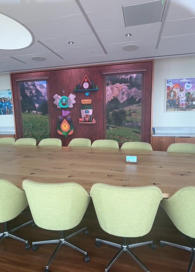 large conference room. A long, light-colored wooden table dominates the scene, surrounded by pale green rolling chairs. Behind the table is a large wall decorated with cartoonish images of a forest scene. Two pictures hang on either side of the wall decoration. The room has a modern feel, with fluorescent lighting and a light-colored ceiling. There are no people visible in the video.