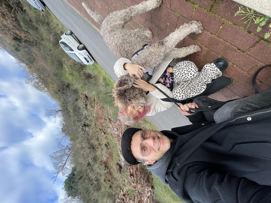 A selfie captures three individuals on a paved path. The foreground shows a man in a black coat, beanie, and glasses, smiling at the camera. Beside him sits a person with pink-streaked hair, embracing a large, curly-haired dog lying on its back. The background includes a white car parked near a road and a hillside with trees. The sky above is filled with clouds.