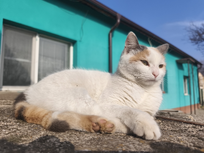 - "A tricolor domestic cat is observed resting on a light gray, textured concrete surface in Valchedram, Bulgaria" by FM-AKM853, licensed under CC BY 4.0