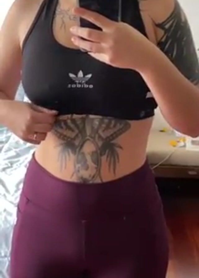 A woman wearing a black Adidas sports bra and purple leggings stands indoors, holding a smartphone up to capture a selfie video. Her midriff is exposed, revealing a prominent tattoo on her stomach. She adjusts the waistband of her leggings, briefly revealing her stomach. Additional tattoos are visible on her arms and chest. A bed and other objects are partially visible in the background, suggesting the setting is a bedroom.
