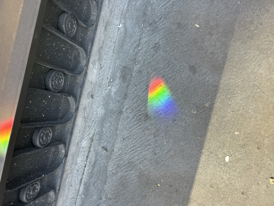 The scene depicts a detailed view of an urban ground surface and an adjacent architectural element in what appears to be London, United Kingdom. A vibrant, trapezoidal rainbow spectrum, approximately 15-20 cm across at its widest point, is projected onto a dark grey, textured concrete or paved surface in the midground. The spectrum displays colors from violet to red. A narrow, elongated section of the same spectrum is visible on the underside of a dark, horizontal structural element positioned at the top of the frame. This structure features several parallel, recessed panels, each containing a raised, circular decorative motif, resembling a stylized rosette or wheel, approximately 3-5 cm in diameter. The surface of this element shows scattered light-colored flecks. The foreground consists of a lighter grey, sunlit concrete surface, separated from the darker concrete by a distinct shadow line. The ground exhibits minor irregularities and small specks of debris. No individuals or active interactions are visible. The lighting suggests direct sunlight interacting with an unseen optical source to create the spectrum. While a precise street or building cannot be identified from the image, the urban pavement and architectural style are consistent with typical street environments found within London.