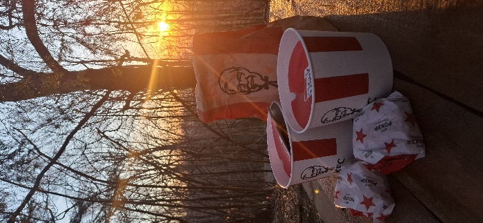 The image displays an outdoor scene at either sunrise or sunset, characterized by strong golden light and lens flare originating from the right. The foreground features a weathered wooden surface. Positioned on this surface are several Kentucky Fried Chicken (KFC) items: one large red and white branded paper bag with Colonel Sanders' likeness, two large red and white branded buckets (one containing a dark utensil, the other showing a red interior lining or lid), and two smaller white-wrapped food items marked with red stars and "KFC POKEP" branding. The background consists of a dense, leafless deciduous forest or wooded area. The sky transitions from light blue to orange-yellow at the horizon. No individuals are visible. The location is an unidentifiable wooded or park area within the city of Unknown, Unknown.
