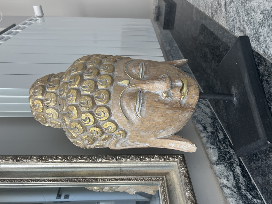 The scene depicts a wooden sculpture of a Buddha head, positioned on a dark gray and white veined polished marble or granite surface, located in a building within the city of Pazardzhik, Bulgaria. The sculpture features light brown wood with visible grain, accented with gold paint on the cranial protuberances (ushnisha), the urna between the eyebrows, and the lips. The eyes are carved as closed slits. The Buddha head is mounted on a black metal rod affixed to a rectangular black wooden base, which rests on the aforementioned marble surface. To the immediate left of the sculpture, a section of a mirror with an ornate, possibly silver-gilded or champagne-colored, decorative frame is visible, reflecting a blurred interior space. Directly behind the sculpture and extending to the right is a modern white panel radiator with vertical fins, mounted against a light gray wall. To the far right, on the same polished marble surface, a dark, square-shaped object or container is present. The overall environment suggests an indoor setting, possibly a hallway or living area.