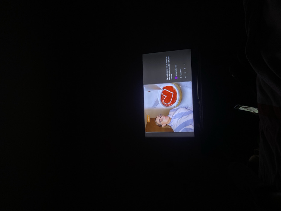 A person is watching a phone screen showing a video of a woman lying next to a cake decorated with a red heart. The phone is held in a dark room, with dim lighting. The person is wearing a grey sweatshirt. Another phone is visible on the right side of the frame. The video on the phone includes Spanish text above the image, likely a caption or description.