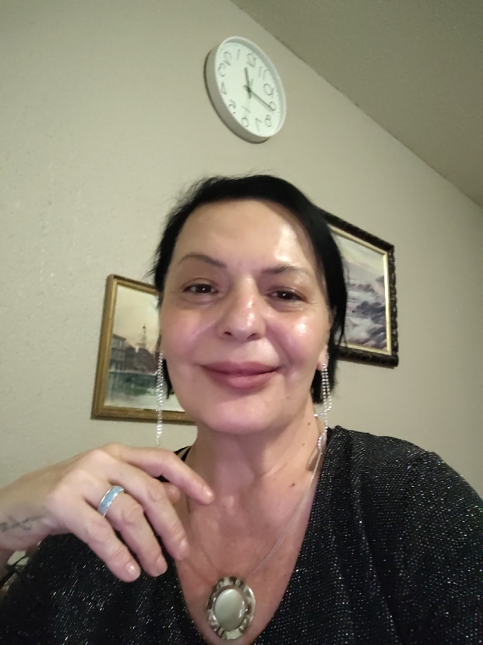 - "A fair-skinned woman poses indoors, adorned with sparkly attire, long, dangling earrings, and a pendant necklace" by FM-Odse83, licensed under CC BY 4.0