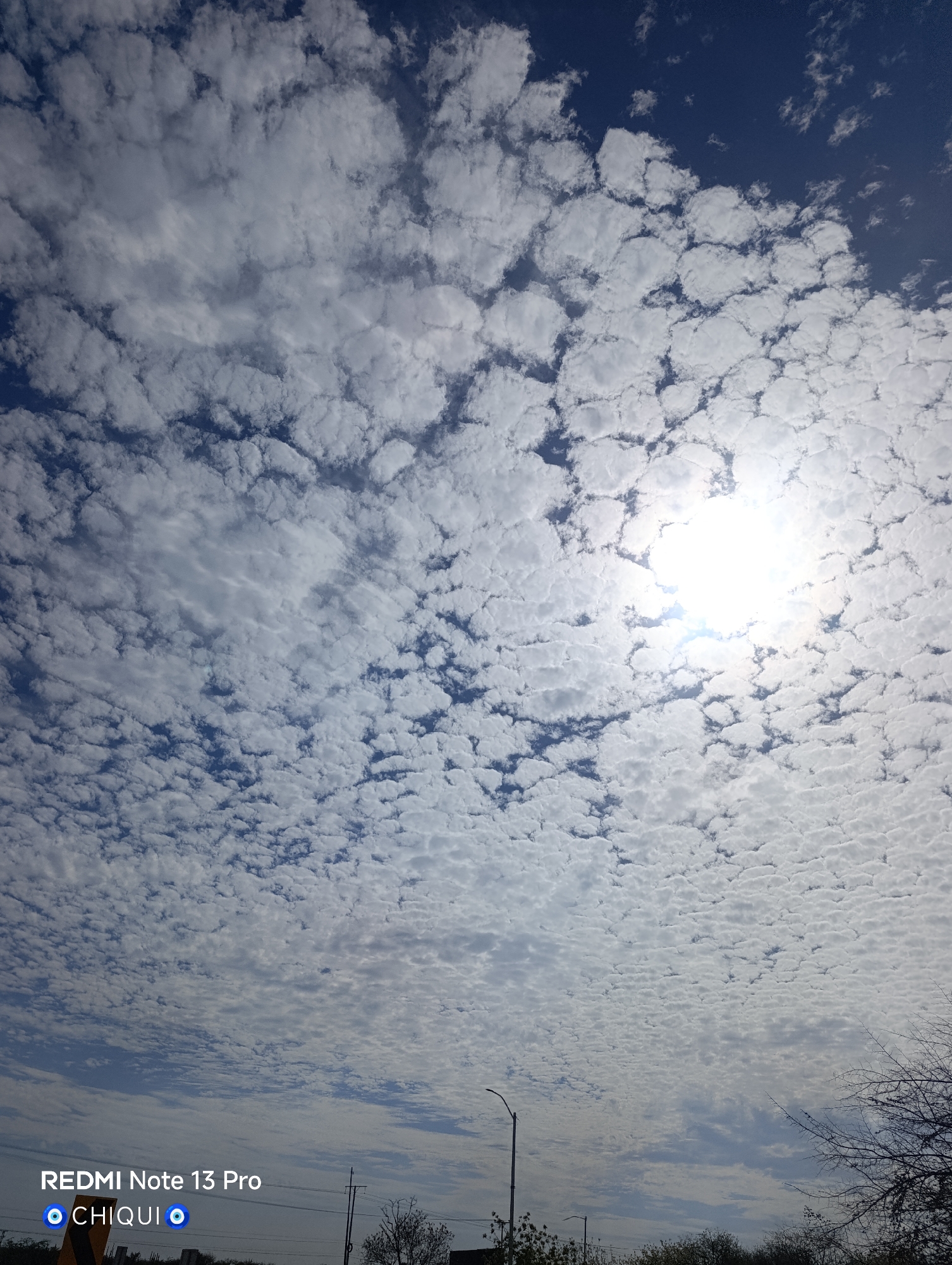 A low-angle shot of a sky filled with altocumulus clouds, with the sun shining through them. The sky is blue where there are gaps between the clouds. At the bottom of the image, there is vegetation and a lamppost, suggesting an urban or suburban environment. The text at the bottom left indicates the photo was taken with a Redmi Note 13 Pro phone. The location appears to be El Dátil, Venezuela. No people are visible in the image.