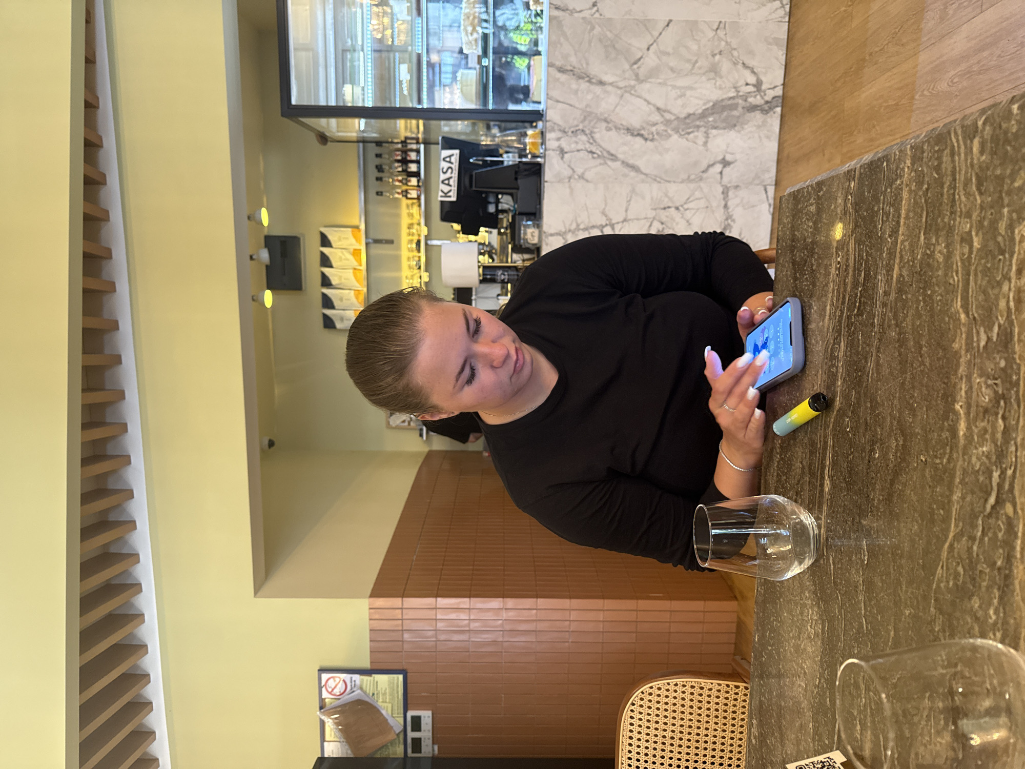 A woman with her hair pulled back is seated at a table in what appears to be a restaurant or café in Boreti, Montenegro. She is holding a blue smartphone and seems to be interacting with it. On the table are a vape pen, two clear glasses, and a marble-patterned surface. The background features a bar area labeled "KASA" and tilework in various colors. The overall environment suggests a modern and stylish interior.
