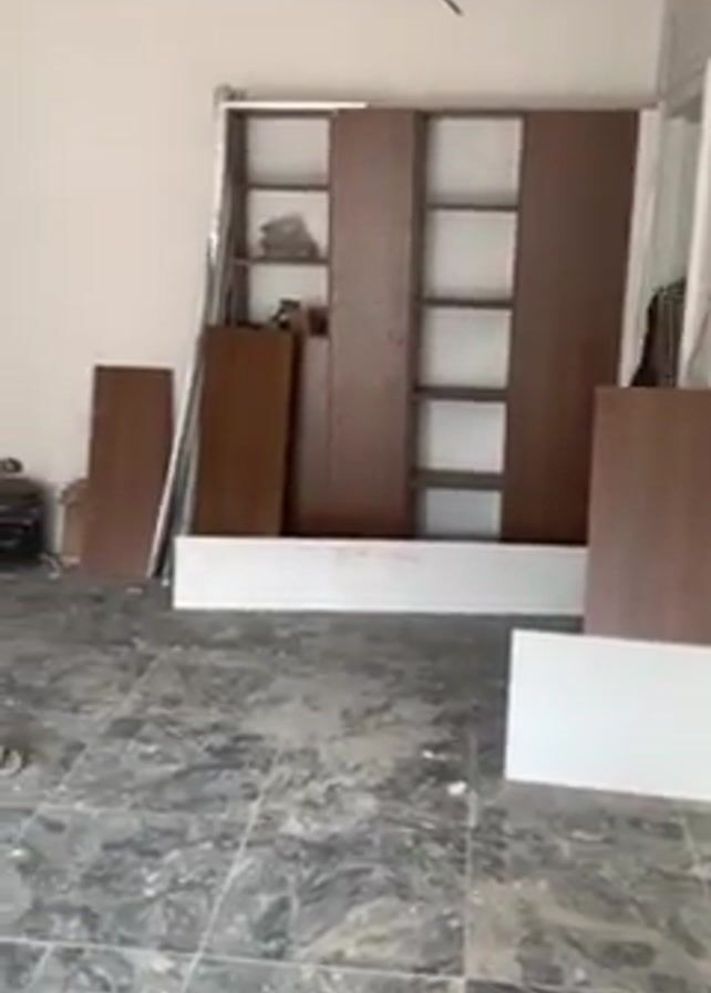 interior of a room under construction. The room has a tiled floor of dark gray stone with a mottled pattern. The walls are white and mostly bare, but sections have been decorated. One wall features a large expanse of white marble-patterned tile. Adjacent to this, a divider has been built with vertical dark wood slats interspersed with three white cuboid shelves. Several pieces of dark wood and white material are lying on the floor. Near the back of the room, a partially assembled wardrobe or bookcase is in progress, with shelves and door panels leaning against it. Construction debris is scattered around the room, including a paint bucket and miscellaneous items. The room appears to be in the final stages of renovation or construction.