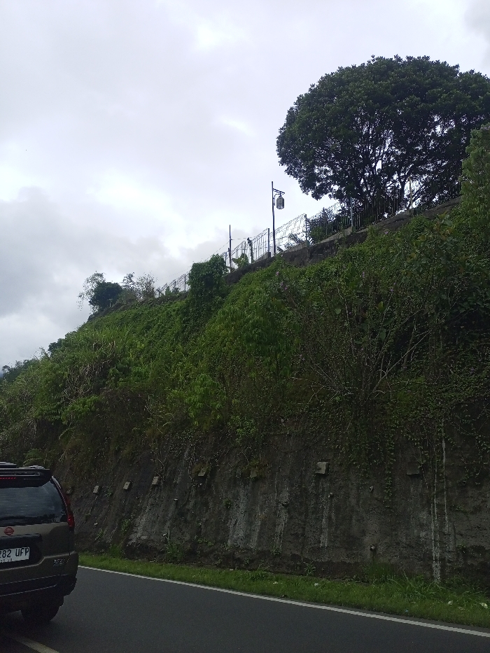 A verdant hillside rises beside a road, with a black SUV parked on the asphalt. Dense vegetation covers the slope, meeting a retaining wall reinforced with square supports. At the top, a metal fence lines a path, punctuated by a lamppost and a large, leafy tree. The sky is overcast, casting a diffused light over the scene.