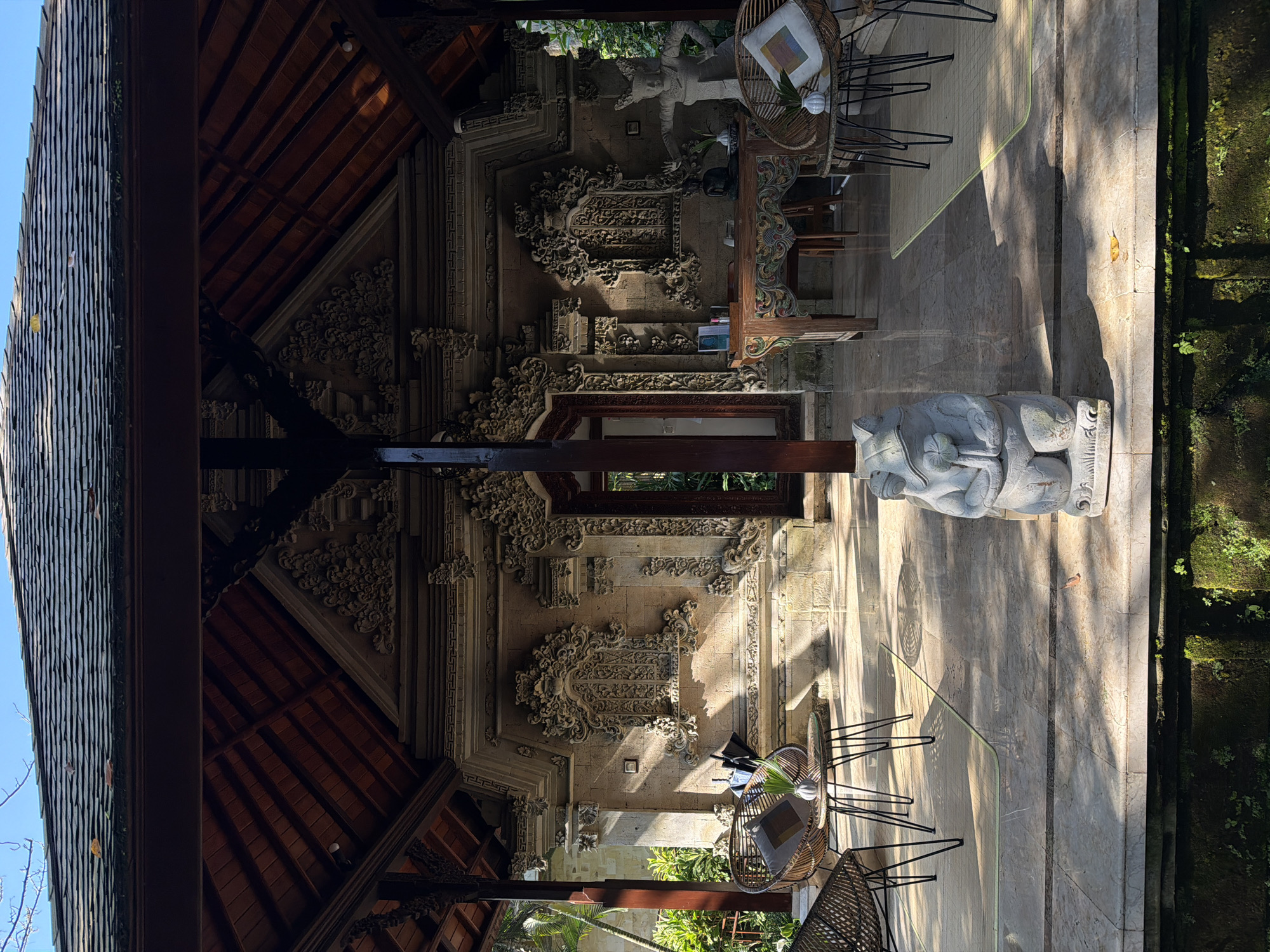 The scene is a view of the interior of a building with Balinese architectural features, including stone carvings, pillars, and a multi-layered roof structure. The location is likely Kedewatan, Indonesia, given the architectural style. The lighting is bright with strong shadows, suggesting an outdoor or open-air setting. There is a stone statue of a mythological creature. Wicker chairs and tables are arranged in a seating area. The floor is stone-tiled. Moss grows in certain areas. The frame shows portions of the tiled roof. The architecture is heavily decorated with relief carvings.