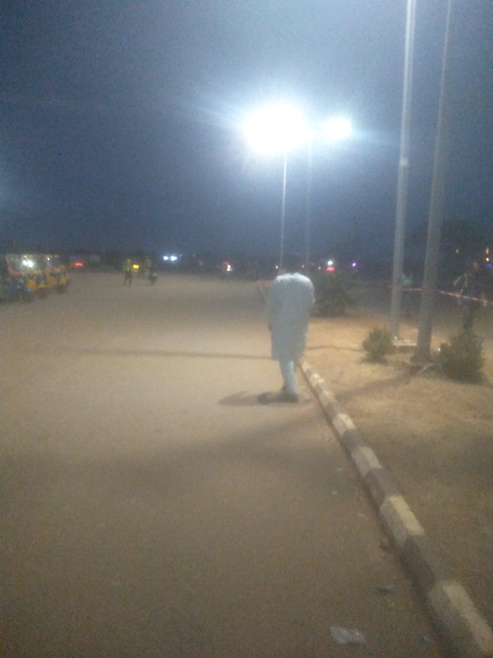 A nighttime shot depicts a person walking on a road illuminated by bright streetlights. The individual, dressed in a white robe, casts a shadow on the asphalt. The scene includes a curb with alternating light and dark blocks bordering the road, while utility poles rise tall and straight along the right side. In the background, indistinct shapes suggest parked vehicles and other pedestrians. The overall atmosphere is dimly lit, with the streetlights being the dominant source of illumination.
