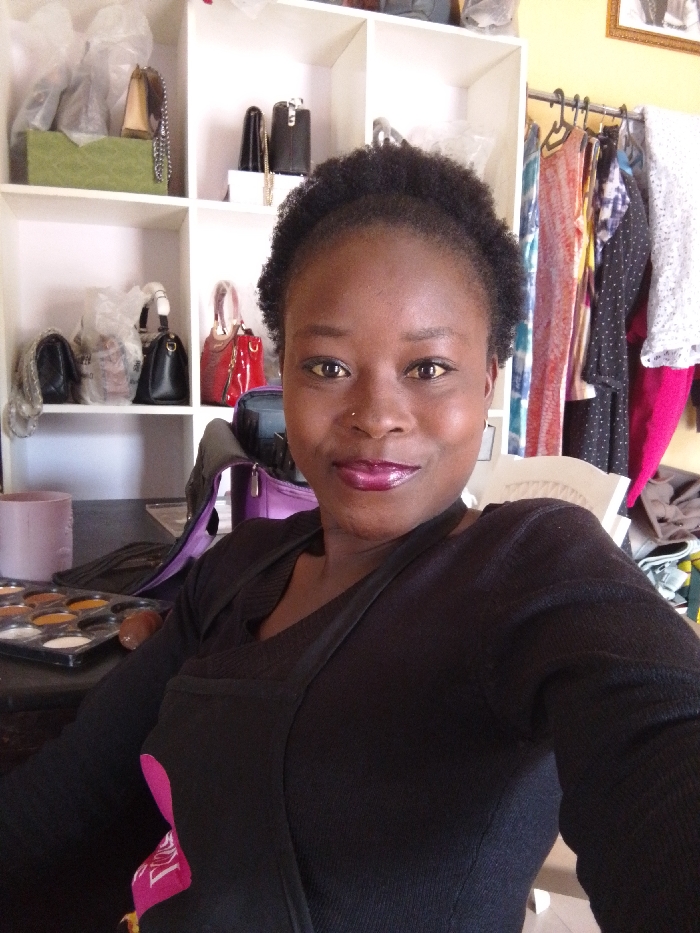 An African woman with short, dark, curly hair and dark, glossy lipstick smiles directly at the camera, capturing a selfie within an indoor commercial setting in Jos, Nigeria. She wears a black long-sleeved top and a black apron featuring a pink design element on the chest. To the woman's immediate left, on a dark tabletop surface, rests a light purple cylindrical cup and a rectangular black tray containing a makeup palette with multiple circular wells filled with various shades of foundation or concealer, alongside a makeup brush. Behind these items, a purple carrying bag is partially visible. The background to the left features a white, multi-compartment shelving unit. The shelves display several handbags of various styles and colors (e.g., black, red, tan), some individually encased in clear plastic wrapping, and one placed within a green rectangular box. To the woman's right, a metal clothing rack holds an assortment of garments on black hangers, displaying diverse colors, patterns (including stripes and polka dots), and textures against a solid yellow wall. The scene suggests a retail boutique or beauty salon environment.