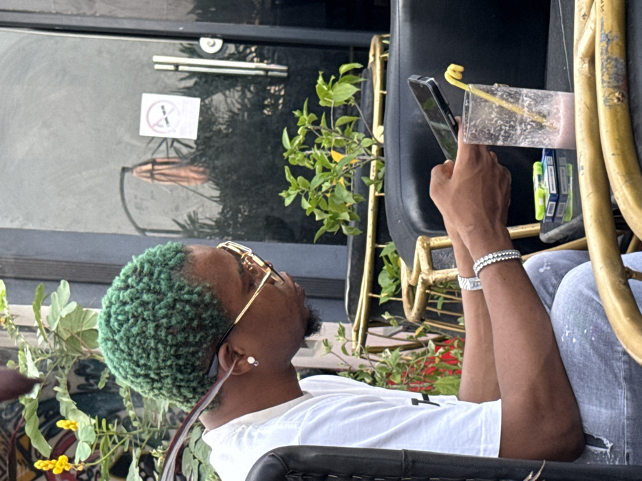 A person with dyed green hair sits outdoors, wearing gold-rimmed glasses and a white t-shirt. They are looking at a smartphone and have a drink with a yellow straw beside them. They are wearing a bracelet and a watch on their left wrist. A no smoking sign is visible on a glass door behind them. Green plants are scattered around.