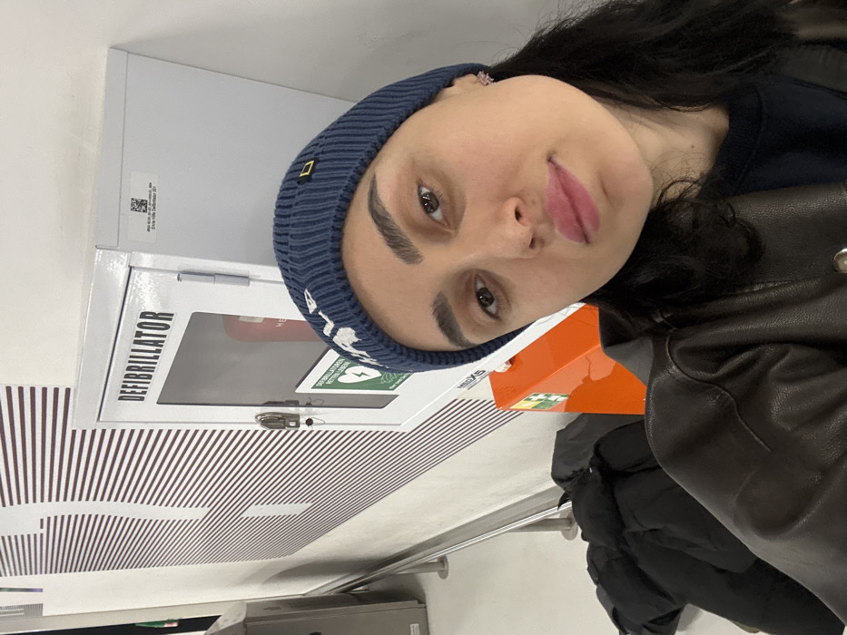 A woman in a dark blue beanie stands beside a white box labeled "DEFIBRILLATOR." The box has a transparent window, revealing a red object and a green heart symbol inside. The woman is wearing a black shirt and a brown leather jacket. She has dark hair, prominent eyebrows, and pink lipstick. An orange box and a black puffy jacket are partially visible in the frame. The background includes a wall with horizontal stripes and a metal rail.