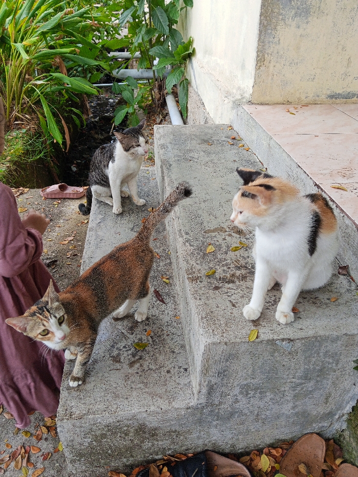 - "The scene is set outdoors in Lhokseumawe, Indonesia, depicting three domestic cats and a partial human figure on and around concrete steps" by FM-JfXSH2, licensed under CC BY 4.0