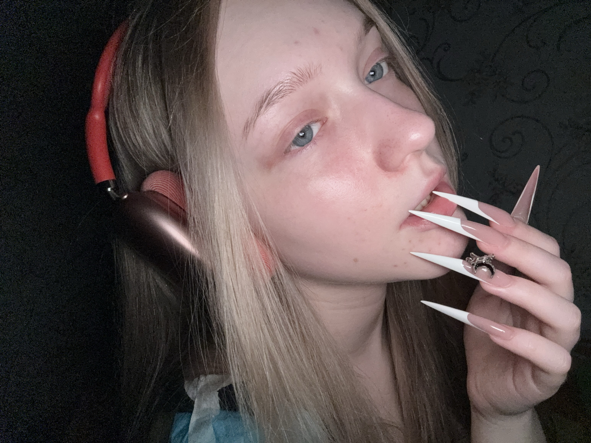 A fair-skinned individual with long, light blonde hair and blue eyes is the central focus of the image. They are wearing red and bronze-colored headphones. The individual is positioned at an angle, looking towards the viewer. Their hand, adorned with long, pointed, French-manicured nails, is close to their mouth. A ring with a black crescent moon and a small bug is visible on one of the fingers. The background appears dark and has a subtle floral pattern. The image's location, Saratov, Russia, is not discernible from the visual elements.