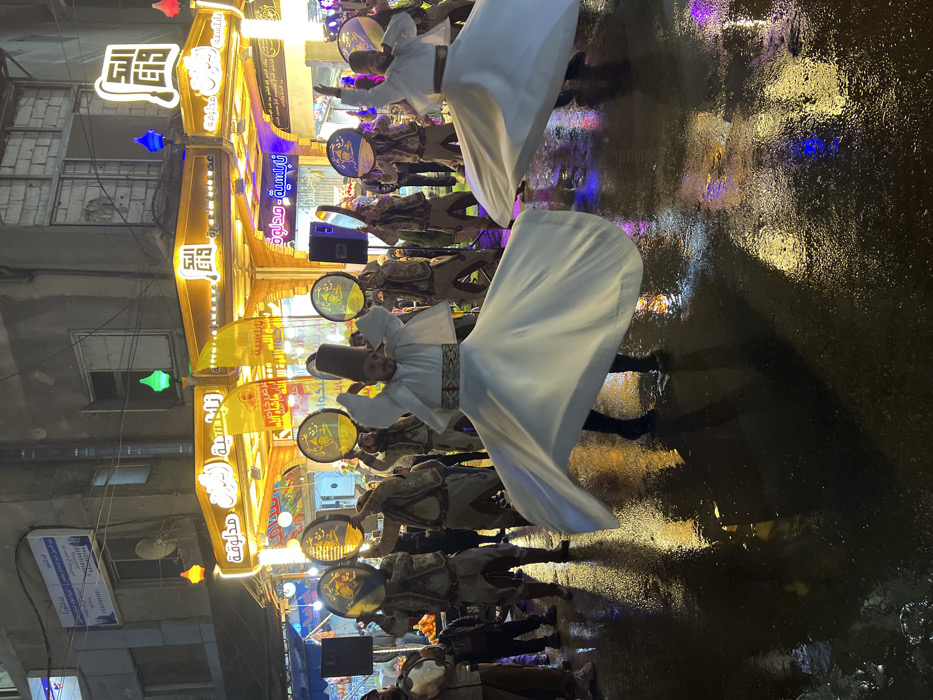 A group of men wearing traditional clothing, including white robes and hats, is performing on a wet street with their reflections visible. Some of the men hold drums. Buildings adorned with illuminated signs and flags are in the background. The scene is brightly lit, possibly at night.