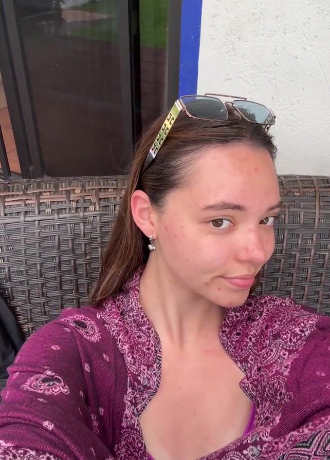 A young woman with brown hair sits in a woven chair, wearing a purple paisley top over a matching bathing suit