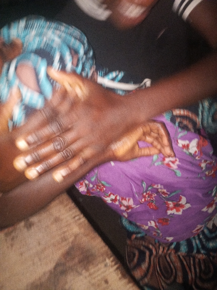 A person sits with a hand on their head, which is covered with a blue headscarf. The hand appears large and is darker in tone, with light-colored fingertips. A smiling individual in a black shirt with white stripes is visible in the upper portion of the frame. Beneath the hands, a purple garment with a floral pattern rests. The background is dimly lit, featuring a wooden surface.