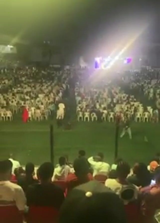 large crowd of people gathered in an indoor stadium-like setting. The majority of the attendees are seated in red and white chairs. The crowd is dense, filling most of the visible seating area. In the background, there is a stage with bright lights and a screen displaying visuals. People on the stage are standing and appearing to be the center of attention. The lighting shifts between a bright white-yellow and a purple hue. The camera is positioned from the back of the crowd, providing a view of the entire scene.