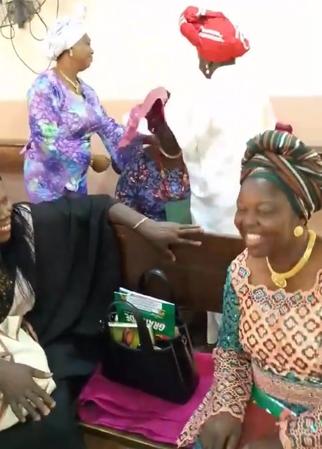 The scene takes place in what appears to be a church or similar gathering space with wooden pews. Several women are present, dressed in colorful, traditional African clothing and headwraps. In the background, a woman in a blue and purple patterned outfit and a white headwrap is adjusting or placing a pink cloth on another woman who is wearing a white outfit and a red headwrap. In the foreground, other women are seated in the pews. One woman, dressed in green and orange patterned clothing, is smiling at the camera. Another woman is wearing a black outfit and holding a white bag. A black bag with a book inside is on the pew. A ceiling fan is visible in the background.