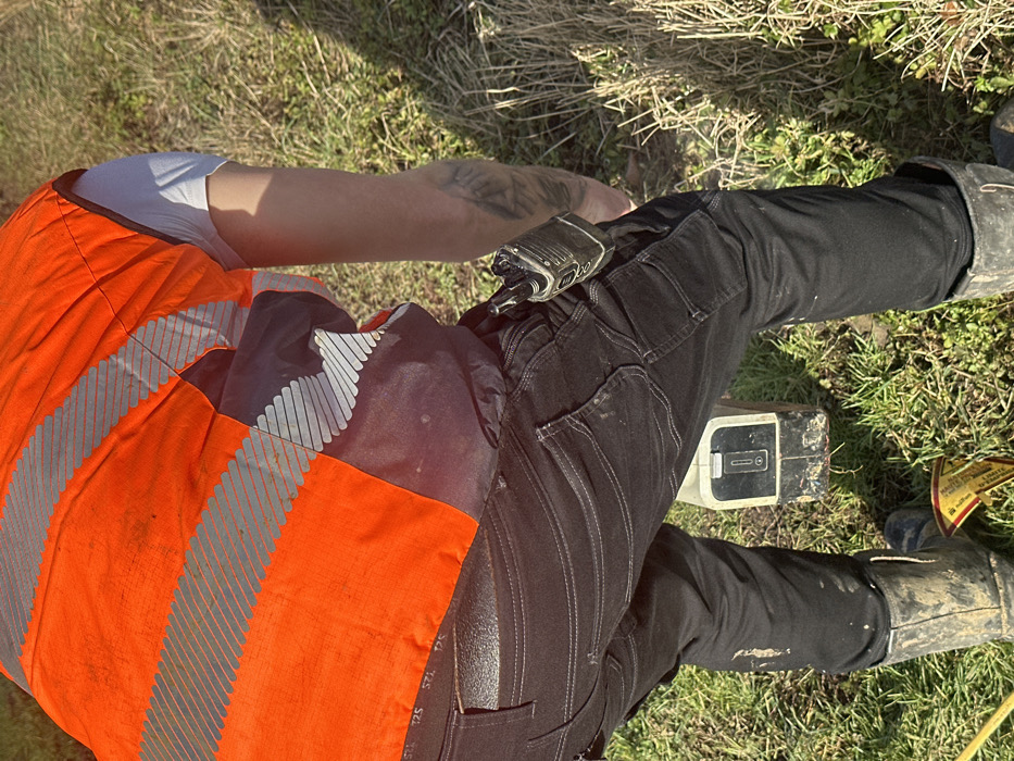 The image depicts an individual engaged in an outdoor activity in Lambres-lez-Douai, France. The person is observed from the upper torso down, bent over, facing away from the camera. They are wearing an orange high-visibility vest with horizontal grey reflective stripes, a white short-sleeved t-shirt underneath, black work pants with multiple pockets, and black rubber boots. A dark belt secures the pants, which feature white stitching. A two-way radio is clipped to the outer right thigh of the pants. The person's right forearm is visible, displaying a dark tattoo. Between the individual's legs, a white and black electronic device, possibly a utility locator or measuring tool, with a small rectangular display is positioned near the ground. The environment consists of uneven ground covered with green grass and patches of dry, brown vegetation. A yellow and red piece of debris, possibly warning tape, lies on the ground near the person's left boot.