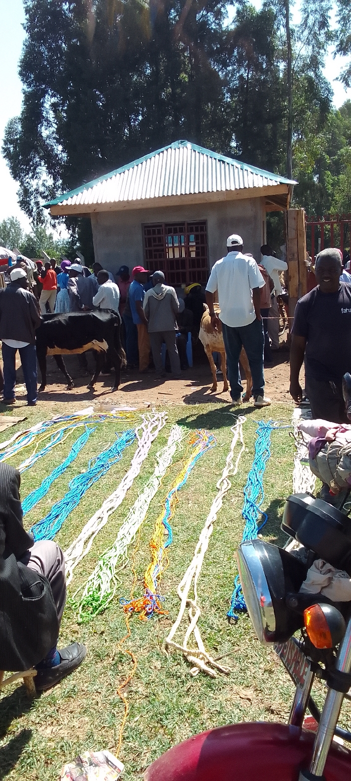 The scene is an outdoor market located in Kakunga, Kenya, with a single-story building in the background, a cow, many people, and rows of colorful rope on the ground