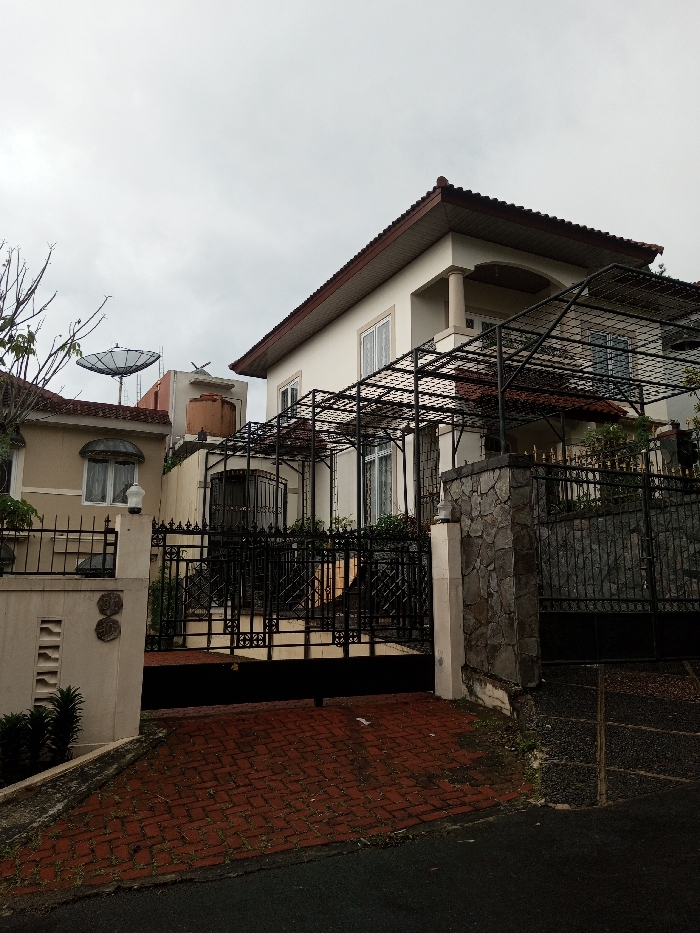A two-story house with a red-tiled roof stands behind a black metal gate and pergola. The house is light-colored with white trim, and has a balcony supported by two columns. A smaller beige building with a satellite dish on the roof is seen to the left, adjacent to a water tank. The driveway is paved with red bricks. The sky is overcast, and the overall scene is urban.