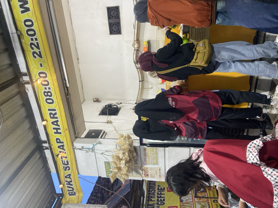 The image depicts an active food stall or small eatery in Sumorame, Indonesia, under artificial lighting, likely during evening hours