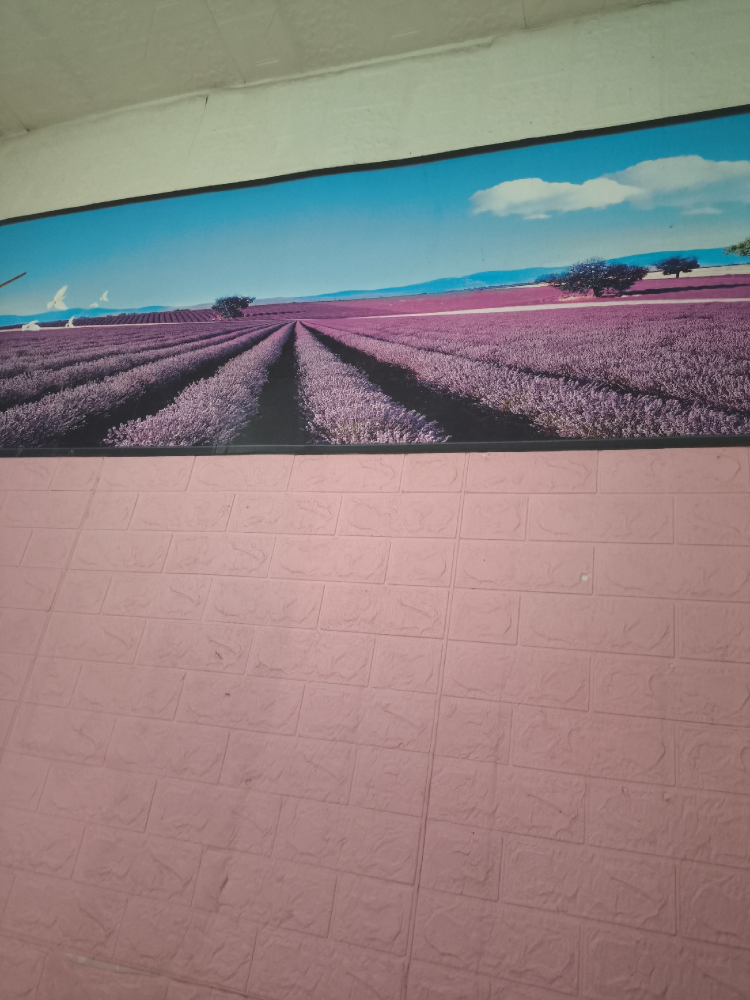 wall with a rectangular picture on top and a pink brick-patterned surface below. The picture depicts a field of purple flowers under a blue sky with scattered clouds. The scene suggests a lavender field landscape. The wall and the picture on it are likely located in an interior space. It is not possible to confirm the location in the city of Longgang District, China, based only on this image.