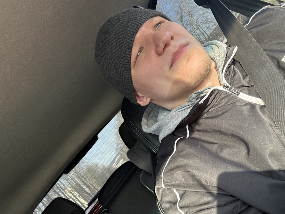 A light-skinned male individual, approximately 20-30 years of age, with blue eyes and light stubble along his jawline, is depicted seated within the interior of a vehicle