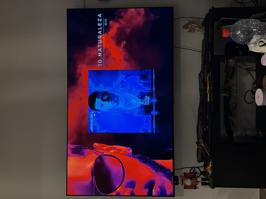 A television displays a vibrant music video. The song is titled "Naturaleza," indicated by text at the top, along with a timer showing "00:26." The video features a blue-toned image of a man, overlaid on an orange and red abstract background. Below him is a red car. To the right of the television is a cluttered black shelf containing various items, including a water bottle and a decorative nutcracker near the bottom.