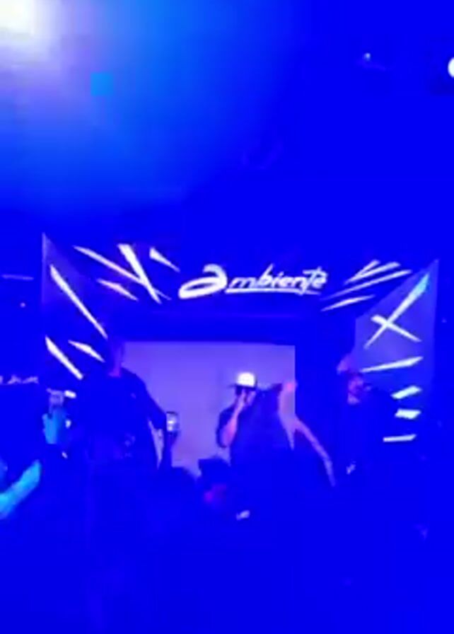 A low-angle shot captures a live performance in a club, featuring three men on stage. The man in the center wears sunglasses, a hat, and a dark outfit, holding a microphone and rapping. To his left, another man in a black jacket and hat gestures while holding a phone. On the right, a third man in a patterned sweater raises his hand, also holding a phone. The crowd below is dense, with many people holding their phones up to record. Behind the performers, a large screen displays "ambiente" in white script, against a backdrop of angled white shapes with yellow edges. Lighting is predominantly blue, with a spotlight above the stage and additional lights overhead. The club has a dark ceiling with visible fixtures and an air vent.