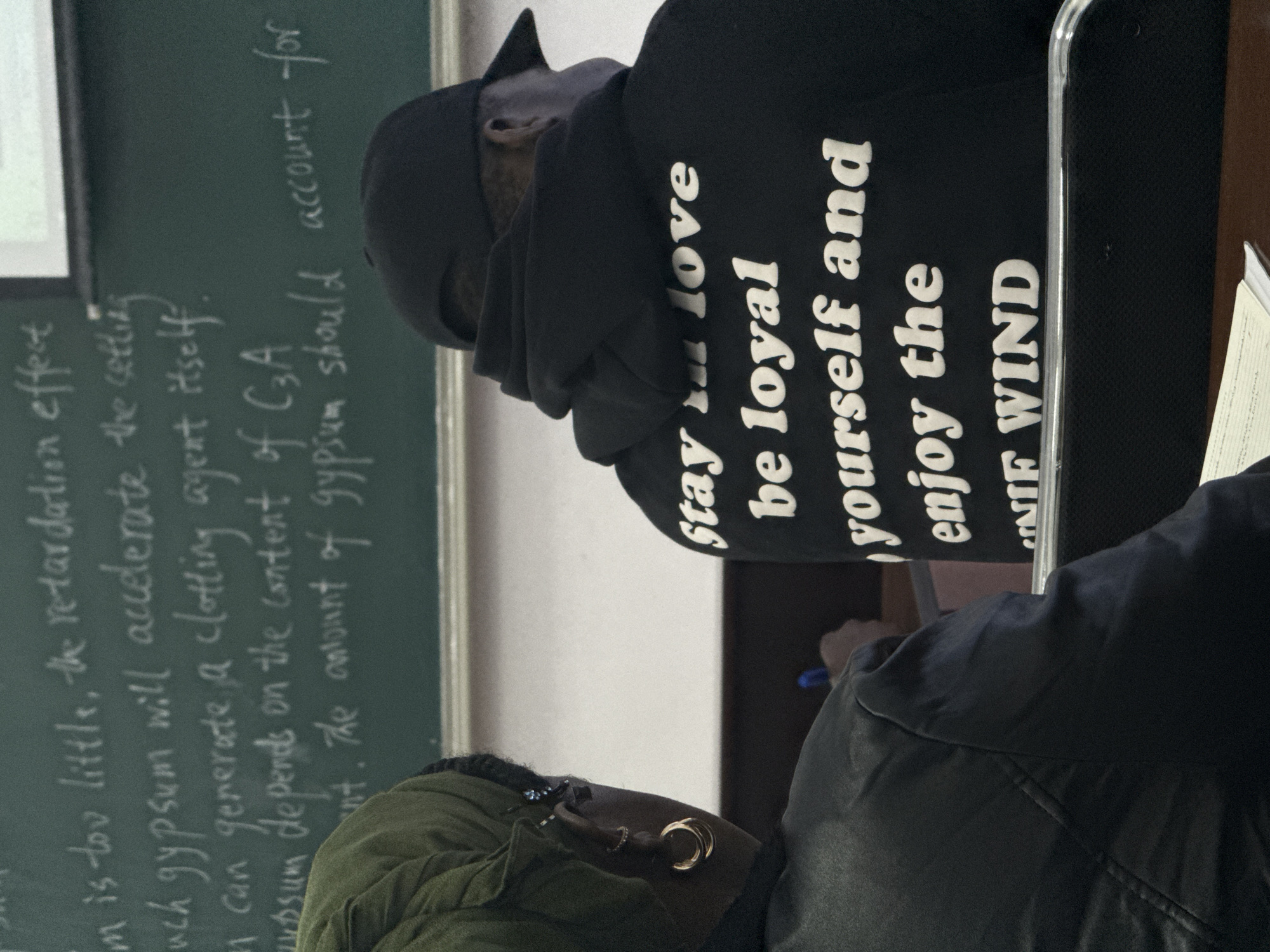 two people in what appears to be a classroom setting. One person, closer to the camera, is wearing a green jacket and has an earring. The second person, slightly further back, is wearing a black hoodie. On the back of the hoodie, there are white printed words that say "Stay love be loyal yourself and enjoy the IF WIND." A chalkboard in the background has handwritten notes about gypsum and its effects, mentioning retardation, setting, clotting, and the content of C3A. The location and whether this is Zhongtun, China, cannot be determined from the image.