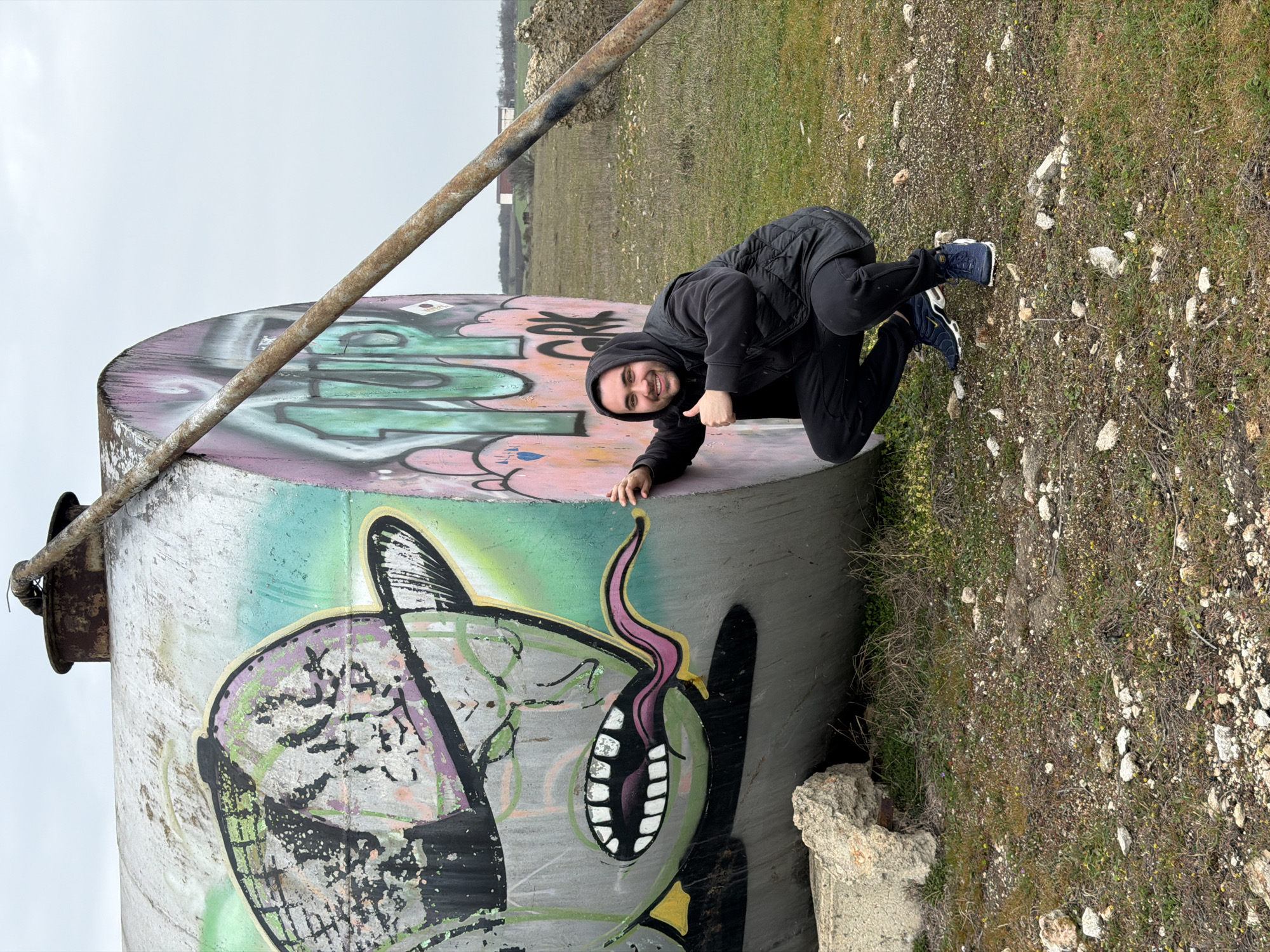 In Tyulenovo, Bulgaria, a male subject is depicted crouching next to a large, weathered, horizontal metal tank situated in an open, sparsely vegetated field. The tank's surface is extensively covered in graffiti. On the left side, a stylized green-faced character wearing a black hat is visible, featuring an open mouth with white teeth and a prominent pink tongue extending to the right. Further right, behind the subject, graffiti includes stylized letters such as "TUP" in teal and pink, and "GRK." A rusty metal pipe extends diagonally from the top-rear of the tank, continuing downwards behind the subject. The male subject, exhibiting dark hair and stubble, wears a black hooded sweatshirt, a black quilted vest, black track pants, and dark blue sneakers with white/orange accents. He is smiling, with his right hand resting on the graffiti-covered tank and his left hand forming a "thumbs up" gesture. The immediate ground is uneven, composed of dry grass, weeds, patches of bare earth, and numerous light-colored rocks and stones, interspersed with small yellow and purple flora. A large, broken concrete block is positioned in the lower-left foreground. The background reveals a flat, open landscape under an overcast sky, with distant fields and a white building featuring a red roof on the horizon.