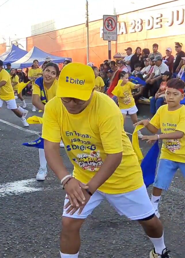 A medium shot shows a group of about 15 people dancing in the street during a parade or festival. The dancers are wearing yellow t-shirts that say "En Tacna usamos bitel 5G" with white shorts or pants and white sneakers. Some of the dancers are waving blue and yellow cloths. There are spectators sitting on the side of the street watching the parade. Behind the spectators there are vendor tents and buildings. The sky is overcast.