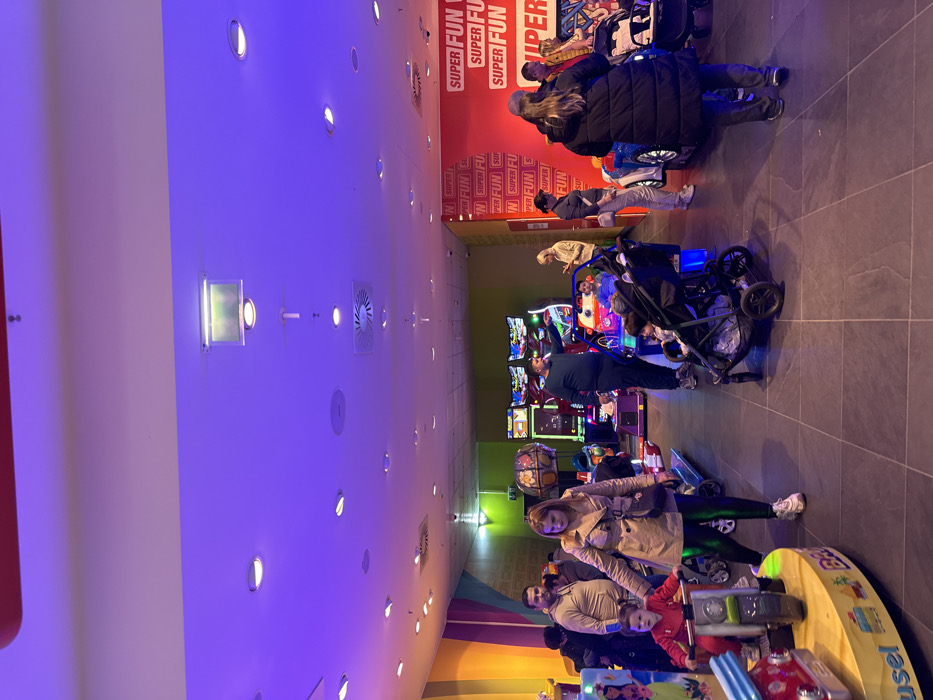 interior of an arcade. The walls are painted with colorful stripes and the ceiling is illuminated with fluorescent lights. There are arcade games on both the left and right sides of the image, including a driving game on the right side. People can be seen interacting with the arcade games, with some standing and others sitting in arcade cars. In the foreground, a child is riding a small motorcycle-like machine that is part of a carousel. Two adults are watching them, while another is in a stroller. On the right side of the image, there is a wall painted with red and white lettering, which says "SUPER FUN" multiple times. The location is within the city of Ludwigshafen am Rhein, Germany. The specific location is an indoor arcade. The environment has a fun and playful atmosphere.