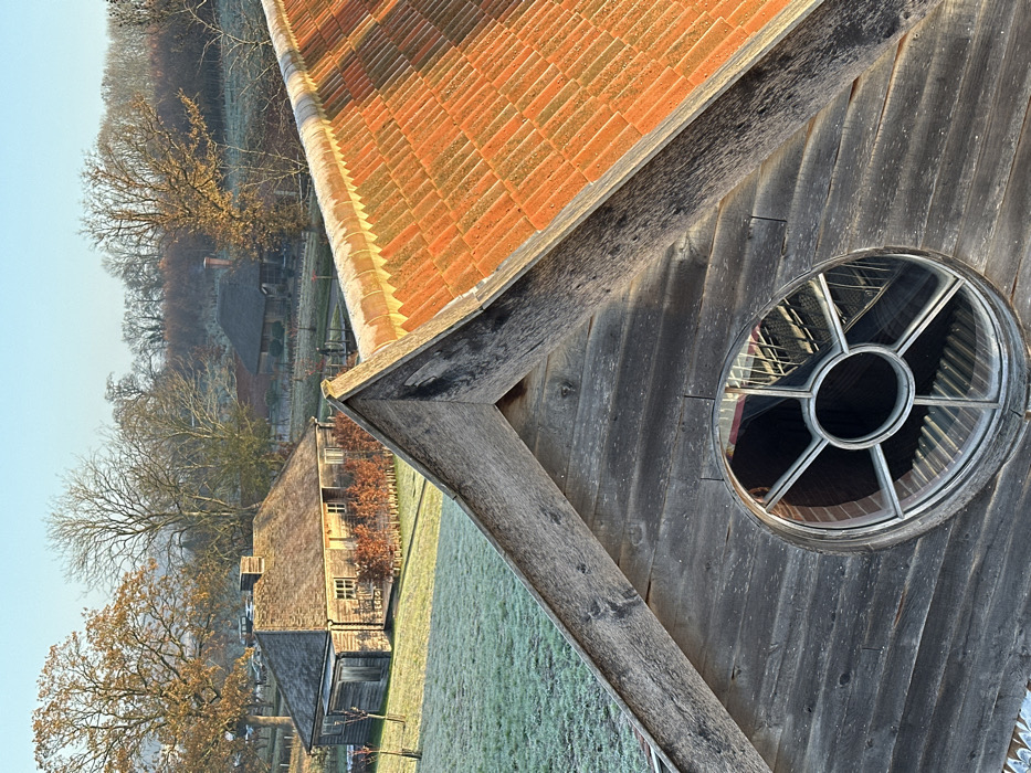 The image depicts a rural landscape located in East Suffolk, United Kingdom, under a clear sky with widespread frost across the ground, indicating cold weather. In the immediate foreground, the weathered grey wooden gable end of a building is visible, featuring a prominent circular window composed of a central hub and six radial panes. To the right, a section of a reddish-orange tiled roof, showing signs of weathering and discoloration, extends into the frame. In the midground, a single-story light brown wooden house with a dark, pitched shingle roof and a chimney is situated on a frost-covered lawn. This structure includes several rectangular windows and a smaller wooden annex attached to its left side. A low, reddish-brown leafless hedge runs parallel to the front of this house. Further in the background, another building with a dark, possibly thatched roof is partially visible, nestled among numerous bare deciduous trees and additional frosty fields. A dense line of bare trees forms the distant horizon under a clear, light blue sky. No individuals or active subjects are present in the static scene.