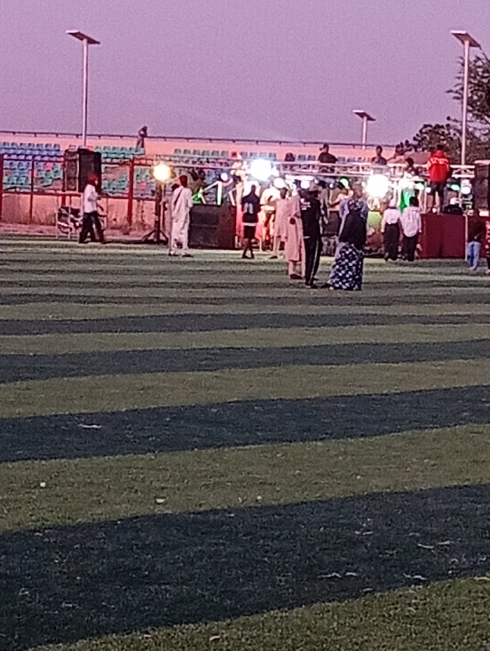A field with alternating dark and light green stripes is in the foreground. In the background, a group of people is gathered on a stage under bright lights near a stadium. Several figures stand on the stadium walls. Street lights illuminate the scene under a dusk sky.