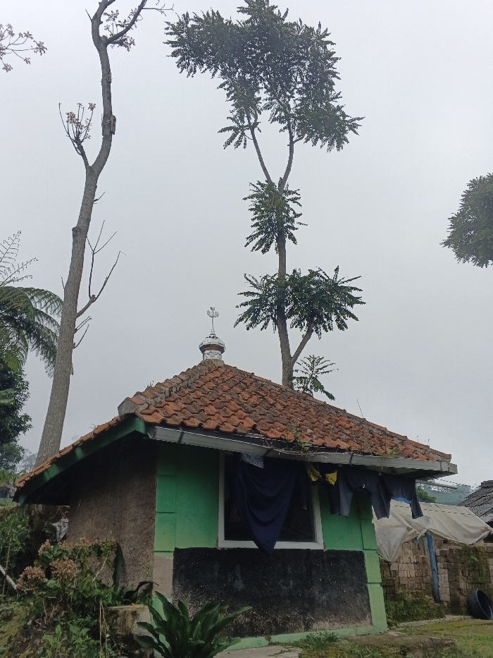 An eye-level outdoor shot depicts a small, single-story building in Pinnwe, Myanmar (Burma), under an overcast, light grey sky. The structure features a weathered, pyramid-shaped roof composed of reddish-brown terracotta tiles, upon which rests a silver-toned finial with a crescent moon and star motif. The walls are partially painted light green on the upper section and a darker, textured concrete or stucco on the lower half. A rectangular window with white trim is visible on the facade, below the eaves. Several articles of clothing, including a dark blue fabric, a yellow garment, and dark pants, are hung from a line stretched across the window. Various green plants and ground cover grow around the base of the building. Tall, slender trees, some with sparse foliage and others with dense green leaves primarily at their upper sections, stand prominently against the hazy sky. In the background to the right, a makeshift structure, possibly a lean-to, is partially visible alongside stacks of reddish-brown bricks. No individuals are present in the scene, and no actions or interactions are depicted.